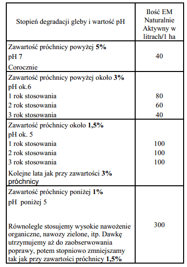 Podstawą przy rozpoczęciu pracy z Technologią EM™ jest wykonanie analizy gleby pod kątem zawartości próchnicy i poziomu pH. Na podstawie uzyskanych wyników dostosowujemy dawkowanie preparatu EM Naturalnie Aktywny. Poniższa tabela przedstawia zalecane dawki preparatu EM Naturalnie Aktywny w zależności od stopnia zdegradowania gleby:Skomplikowany proces symbiozy roślin i mikroorganizmów glebowych posiada zdolność samoregulacji dopiero od pewnego poziomu. Gleboznawcy ustanawiają dolną zawartość węgla na poziomie ok. 1% (czyli zaw. próchnicy ok. 2%). W glebie przy takim poziomie węgla azot może być wykorzystany do wzrostu roślin. Optymalna regulacja zaczyna się od około 2,5% węgla (ok.5% próchnicy). Jednocześnie stosunek węgla do azotu musi zawierać się pomiędzy 7/1 a 10/1. Na podstawie wiosennej mineralizacji może być oszacowana zdolność plonotwórcza gleby. Typową glebę zawierającą ok. 1% węgla można nazwać zdegradowaną. Zawiera ona w warstwie ornej ok. 3,5t/ha organicznego azotu, z którego co roku mineralizuje się ok. 1-2%. Przy wiosennej mineralizacji otrzymuje się 35-70 kg/ha( N-NO3). Organiczne nawożenie może wnieść dodatkowo około 40kg azotu. Na przykładzie pszenicy ozimej, ogranicza to jej plon do poziomu 3-4 t/ha. W produktywnej ożywionej glebie, która z reguły należy odtworzyć, zawartość organicznego azotu w warstwie powierzchniowej ( o głębokości ok. 10 cm) wynosi nawet 19 t/ha. W okresie wegetacji, uwalniane jest w glebie min. 300 kg/ha azotu. Jest to dolna granica przy plonie pszenicy ok. 10 t/ha. Taka gleba nie potrzebuje już więcej wapnowania, ponieważ sama utrzymuje się w równowadze chemicznej. Powszechnie wiadomo, że naturalny proces odbudowywania żyzności gleby może trwać wiele lat i jest uzależniony od nawożenia, rodzaju uprawy i płodozmianu, następnie od lokalnego klimatu, stosunków wodnych, typu gleby itd. Z tego wynika, że jest to proces długotrwały. Życie biologiczne w glebie przy jej intensywnej uprawie i braku nawozów organicznych trzeba wspierać z pomocą Efektywnych Mikroorganizmów EM ™. Jeśli do masy organicznej w glebie dostarczymy Efektywne Mikroorganizmy EMTM wówczas zaczynają one dominować nad mikroorganizmami chorobotwórczymi, co objawia się fermentacyjnym procesem rozkładu i mineralizacji. Dla osiągnięcia optymalnych rezultatów stosowania tej technologii należy skrupulatnie przeprowadzać zabiegi oprysku wg poniższego harmonogramu: I. Okres jesienny, zaszczepienie gleby Efektywnymi Mikroorganizmami. Oprysk preparatem EM Naturalnie Aktywny i EM-5 należy przeprowadzić już po zbiorach owoców. Zabieg ten przeprowadzamy za pomocą opryskiwacza sadowniczego, kierując strumień oprysku w kierunku dolnych partii drzewek i na glebę. Celem tego oprysku jest wprowadzenie mikroorganizmów do gleby i zabezpieczenie jej przed procesami gnicia zachodzącymi przy rozkładzie opadających liści. Ponadto preparat EM-5 chroni przed rozwojem patogennych grzybów w opadłych liściach które z wiosną stanowiły by niebezpieczne siedlisko chorób. Podstawowa dawka EM Naturalnie Aktywny w tym zabiegu wynosi 40l/ha w 400 litrach wody i 2litry EM-5 (oprysk łączony). II. Początek wiosny, pojawienie się zawiązków liści. Pierwszy wiosenny oprysk preparatem EM Naturalnie Aktywny należy przeprowadzić w momencie gdy na drzewach pojawiają się zawiązki liści. Dla wzmocnienia efektu ochronnego jeszcze przed rozpoczęciem kwitnienia EM Naturalnie Aktywny w ilości 20l/ha w 300l wody łączymy z EM-5 w ilości 2-3 litrów/ha (oprysk łączony).