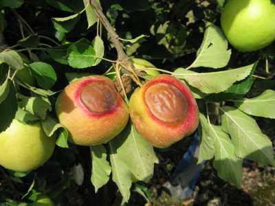 Oparzenia słoneczne owoców powstają w wyniku długotrwałych upałów w okresie lata i występują przeważnie w ciepłych krajach, np. Hiszpania, Francja i USA, ale w ostatnich latach również w Polsce. Wówczas na owocach pojawiają się żółtobrunatne plamy o średnicy do 2,5 cm, które najlepiej są widoczne na odmianach o czerwonej i jasnej skórce. Stosowanie preparatów siarkowych do ochrony po czerwcowym opadzie owoców zwiększa ich podatność na oparzenia słoneczne. Powodem tego zjawiska jest unowocześnianie sadów - drzewa są mniejsze i mają mniej liści, które nie chronią owoców przed nadmiernym nasłonecznieniem. Także ocieplanie się klimat ma wpływ na oparzenia słoneczne owoców. Poparzenia słoneczne mogą występować, gdy letnie cięcie drzew odsłoni owoce lub gdy pogoda sprawia, że jabłka są narażone na silne działanie promieni słonecznych przed zbiorem. Najbardziej narażone są owoce w południowo-zachodniej części korony. Zdarza się, że w przypadku intensywnego plonowania, gałęzie wyginają się i odsłaniają owoce. Poparzeniom owoców może również sprzyjać stres wodny oraz niska zawartość wapnia w owocach. Aby zapobiegać oparzeniom słonecznym owoców należy unikać wystawiania ich na promieniowanie słoneczne przez odpowiednie cięcie oraz formowanie koron drzew. Cięcie letnie drzew należy prowadzić tak, aby nie odsłaniać gwałtownie owoców, które wcześniej były chronione przez liście. We Włoszech do schładzania drzew w czasie upałów stosuje się zraszacze ponadkoronowe oraz opryskuje się drzewa roztworem glinki kaolinowej. W Stanach Zjednoczonych do ochrony sadów przed poparzeniami słonecznymi owoców stosowany jest preparat Rainox na bazie naturalnego wosku z drzewa palmowego oraz Pur Shade na bazie wapnia.