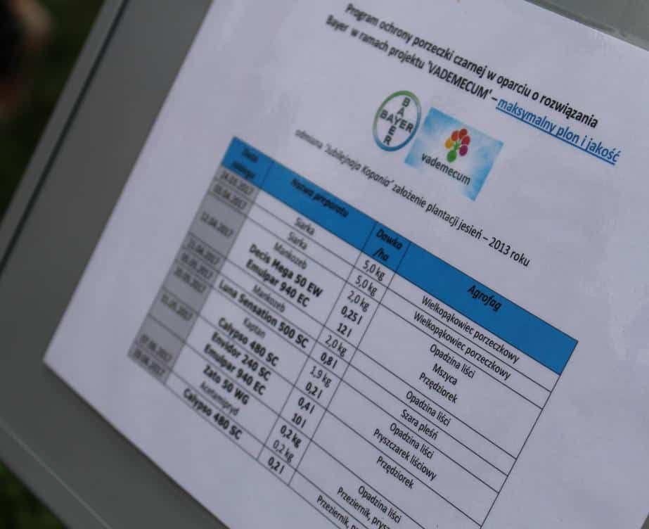 Głos zabrał również Radosław Suchorzewski z firmy Bayer, który wyjaśnił zebranym istotę programu Vademecum. Preparaty stanowiące jego podstawę, m.in. Luna Sensation, Zato, biologiczne Serenade i Emulpar, dobierane są indywidulanie dla danego klienta. Preparaty biologiczne dają możliwość ograniczenia ilości substancji stosowanych w ochronie, przez co owoce stają się bardziej atrakcyjne dla odbiorców. Oprócz tego, program opiera się na fachowym doradztwie i sygnalizacji. Pomagają w tym stacje meteo (jedna z nich znajduje się na terenie gospodarstwa dr Baryły). – Zarówno przemyślane decyzje, jak i wykonywanie zabiegów we właściwym momencie to składowe zrównoważonego rolnictwa, które jest ekonomicznym i efektywnym sposobem prowadzenia ochrony – podkreślał Pan Suchorzewski.