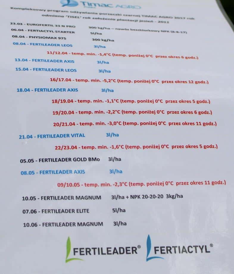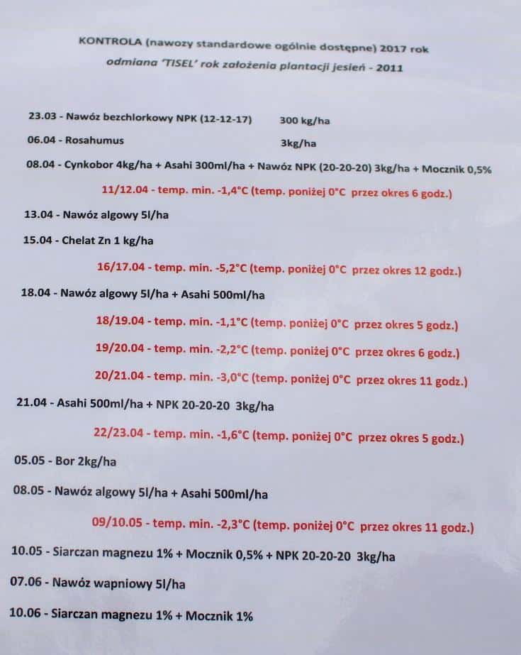 Zabiegi wykonane na odmianie Tisel, program biostymulujący Timac Agro; Jeśli chodzi o wspomaganie roślin podczas przymrozków oparto się na biostymulujących produktach Fertileader Axis i Vital. Samych zabiegów dolistnych było 10, w tym połowa związana była z przygotowaniem roślin na spadek temperatur, a później w wychodzeniu ze stresu. Czyli dodatkowo około 4-5 zabiegów. – Ktoś kto działa wybiórczo, niech nie liczy na efekty – stwierdził dr Baryła.