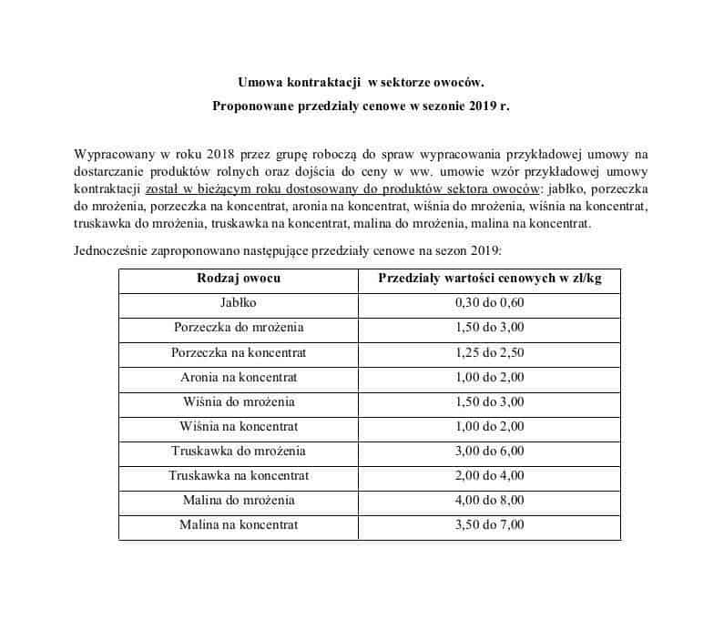 Na stronie internetowej MRiRW został zamieszczony projekt umowy kontraktacyjnej wraz z przedziałami cenowymi na sezon 2019, które zostały zweryfikowane przez Instytut Ekonomiki Rolnictwa i Gospodarki Żywnościowej - Państwowy Instytut Badawczy.