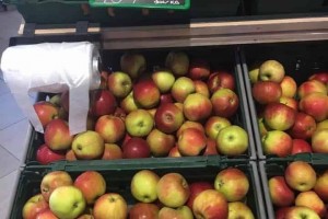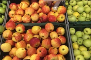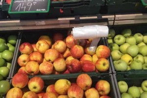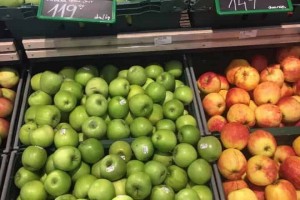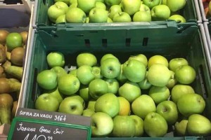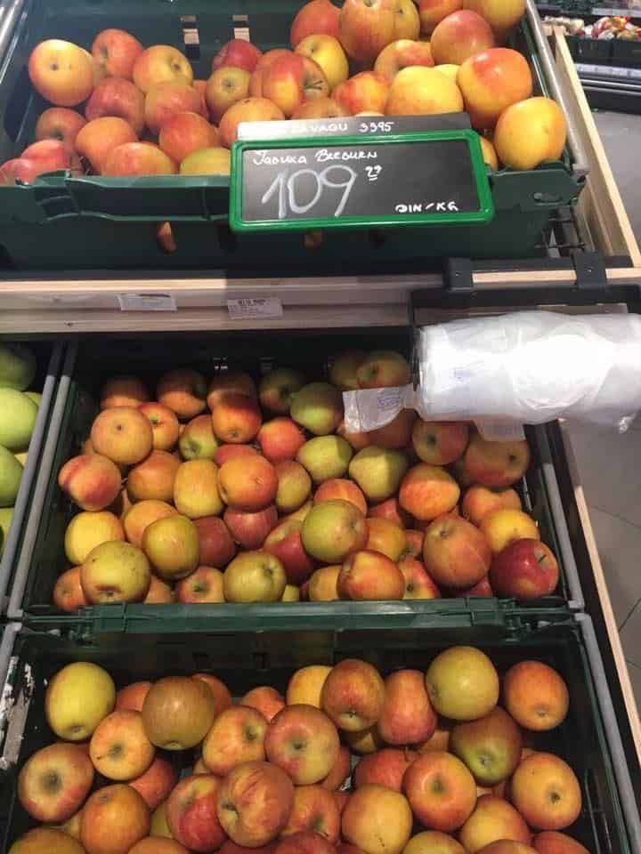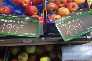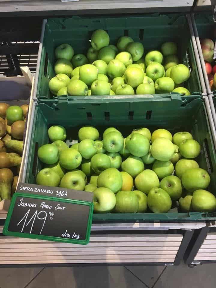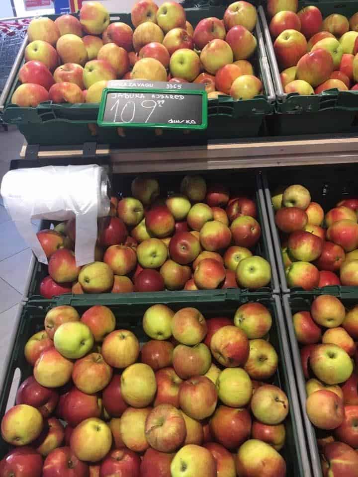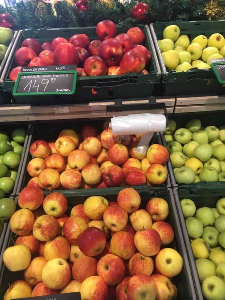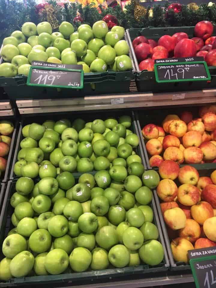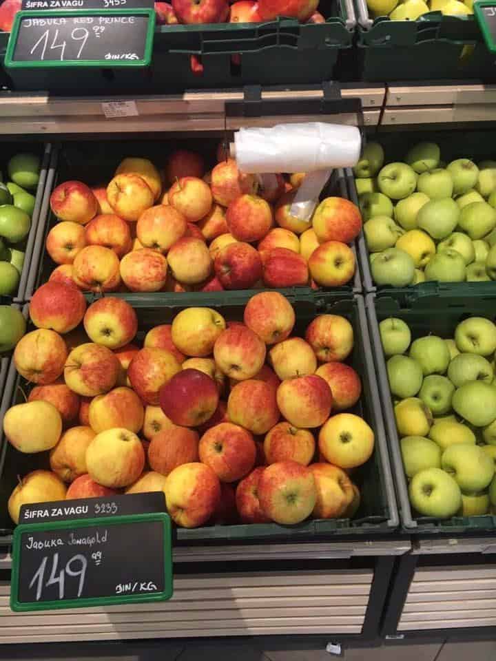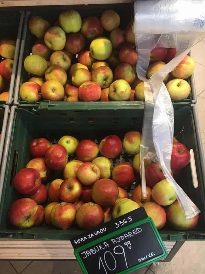 Jabłka w serbskim supermarkecie. Jak widać dzisiejszy wybór jest bardzo duży, ceny od 110 SRD/kg (3,85 zł/kg) za odmiany standardowe takie jak Idared i Jonagold (pewnie z Polski) do 199 SRD/kg (6,90 zł/kg) za odmiany Modi i Kiku.