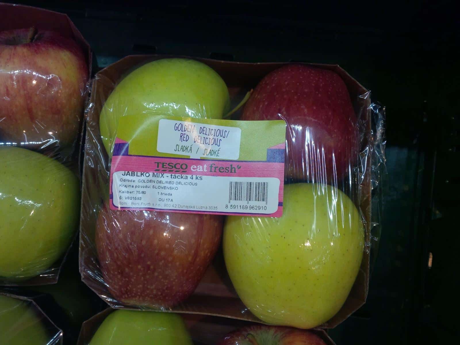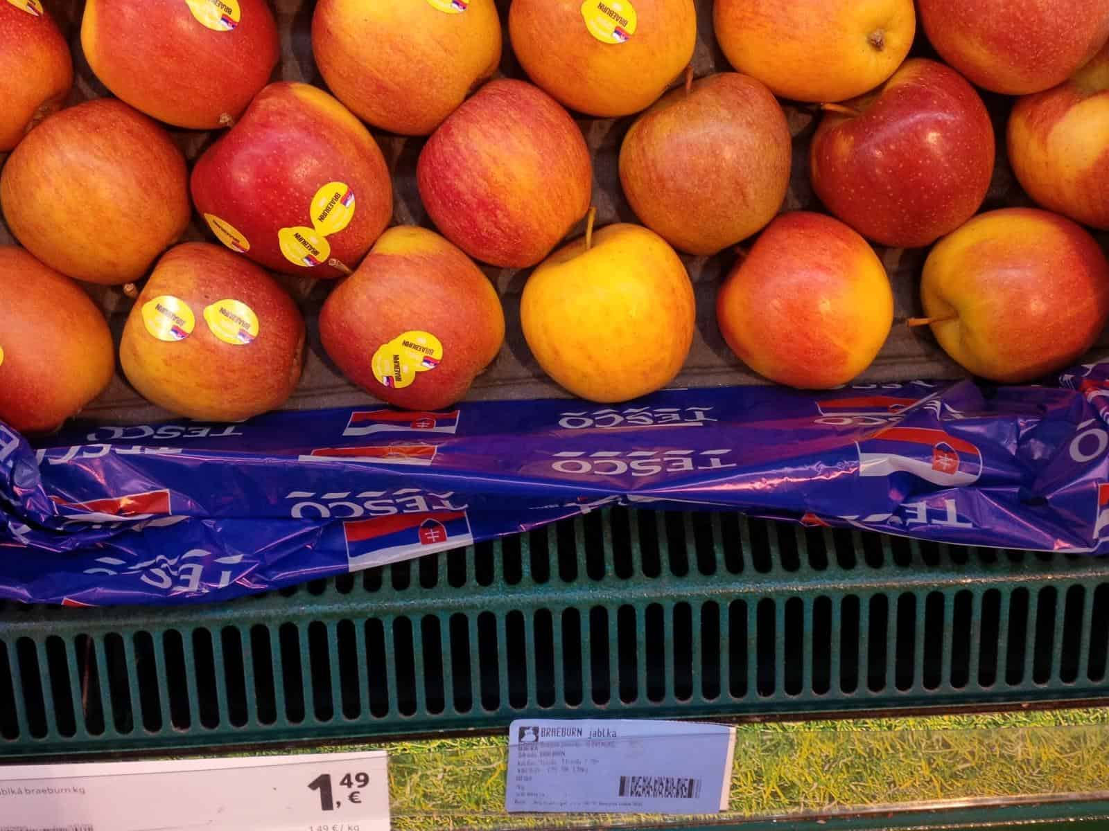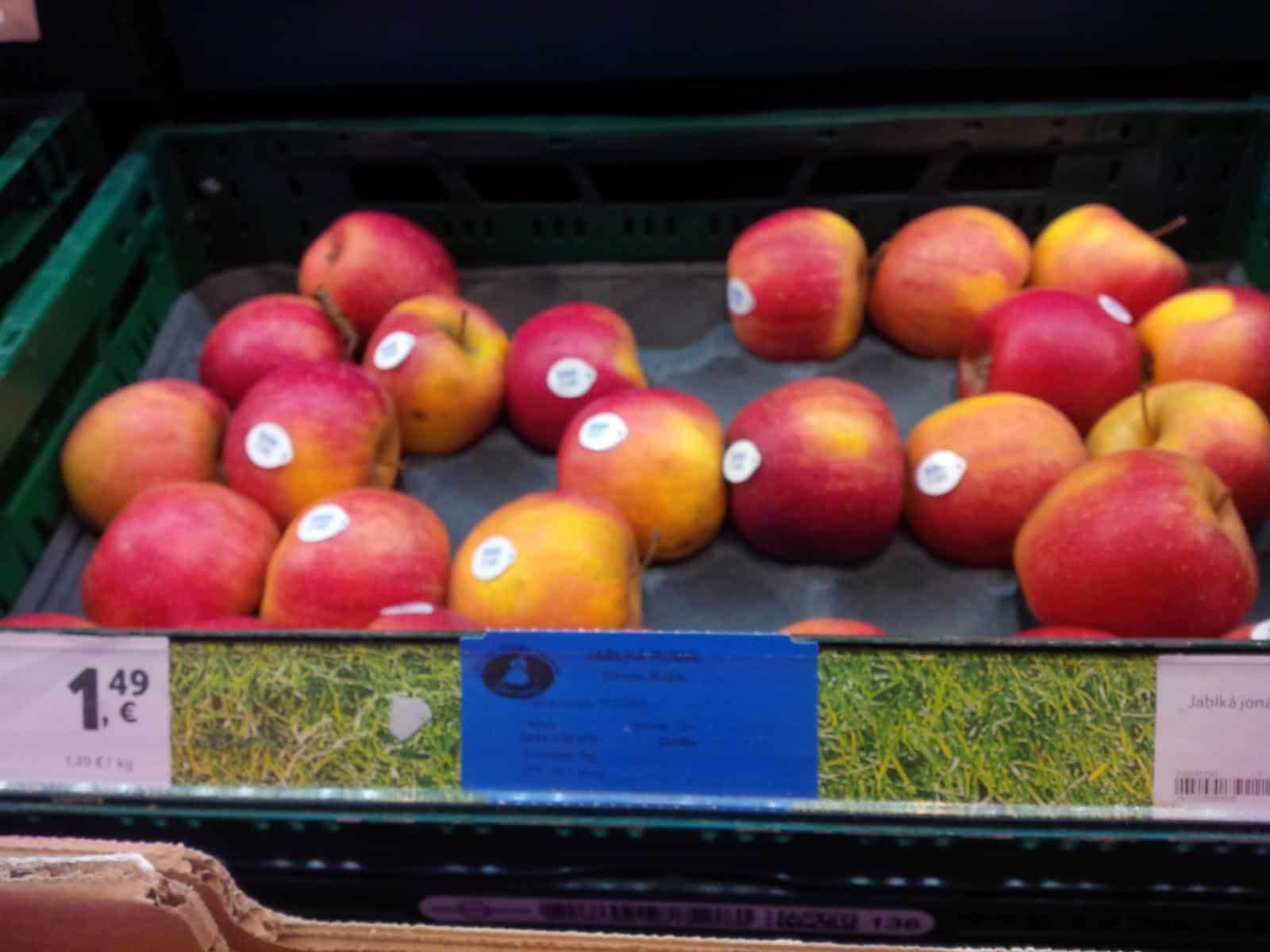 Kolejnym miejscem, gdzie sprawdziliśmy ceny za jabłka była Słowacja. Mieliśmy okazję odwiedzić supermarket popularnej również w naszym kraju sieci. Asortyment stanowiły głównie jabłka z Polski, ale były też słowackie, czeskie i francuskie.