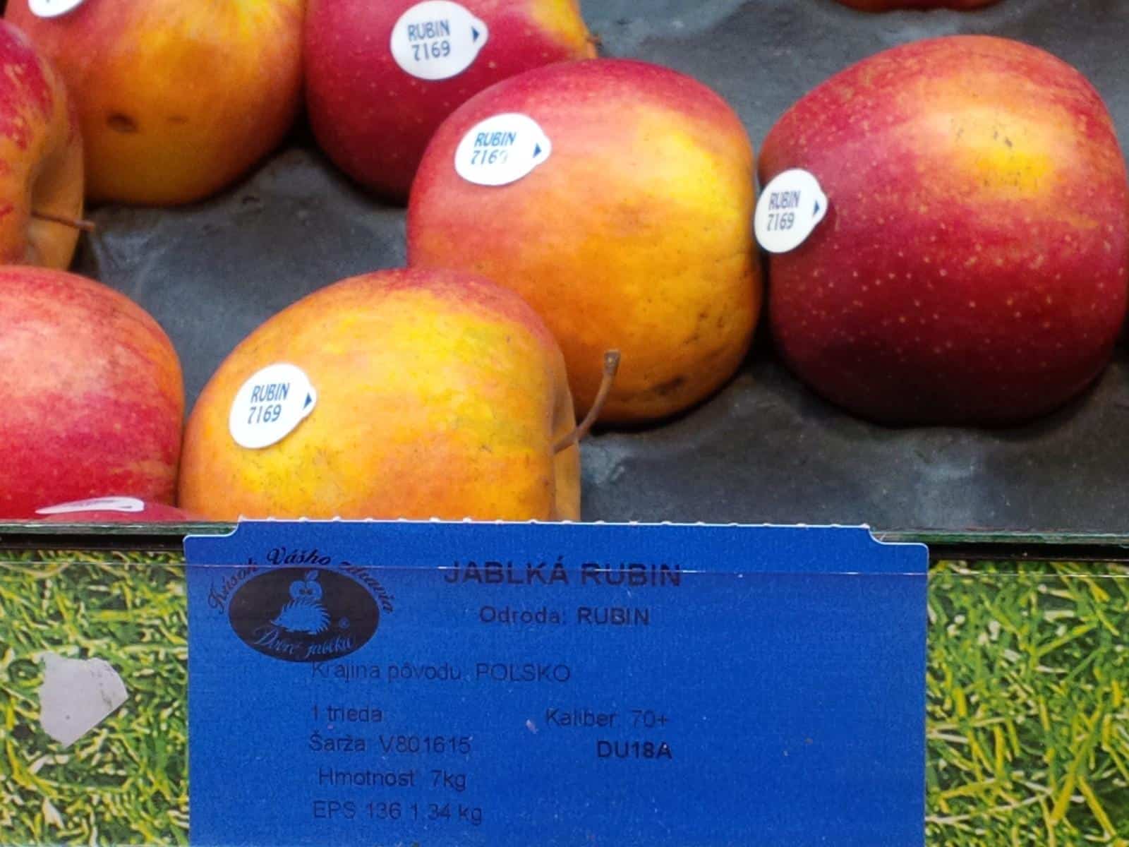 Dobrze prezentował się słowacki Braeburn i czeski Jonagold (1,49 eur.kg). Najdroższy był Granny Smith oraz Red Delicious, również wyprodukowany przez słowackich sadowników – cena wynosiła 2,49 eur/kg, czyli 10,35 zł/kg. Do wyboru były również jabłka na tackach, pakowane po 4 sztuki (Golden Delicious i Red Delicious).